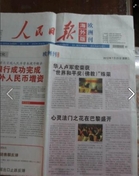 2012-7-25 《人民日报》海外版欧洲刊报道卢台长荣获“世界和平奖(佛教)”殊荣
